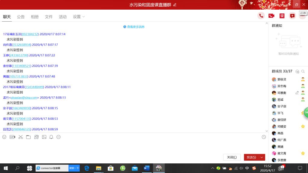 为了高效开展网络教学,提高教学质量,发挥网络教学资源优势,克服网络教学中无法面对面交流、无法及时了解课堂学习效果等劣势。主要采用以下几项措施:(1)制定教学计划,教学大纲,教学进度计划。针对疫情期间制定教学计划,教学进度计划,有组织实施教学,让学生了解课程教学内容,教学重点,难点,教学进度,有计划完成任务;(2)课前课后打卡。每一堂课前课后打卡,督促学生按时听课。学生每次课都能按时参与听课;(3)课堂效果评估。对课程内容布置作业,对作业进行查阅、评价、鼓励。每天对作业情况进行总结,评出优秀者,群里表扬,树立榜样。(4)认真答疑。鼓励学生提问,对学生提出的问题,认真解答。(5)用好网络资源。充分利用MOOC、直播课程、优质课程及结合本人课件学习。