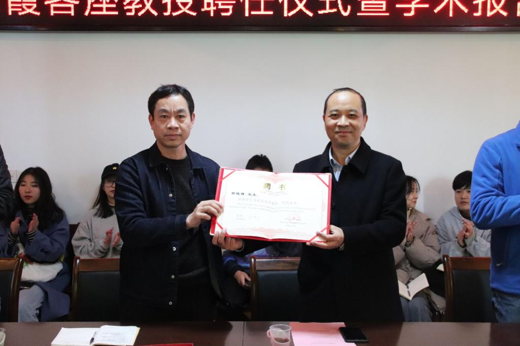 12月2日下午三点半,贺晓霞客座教授聘任仪式暨学术报告会于千禧楼六楼会议室顺利开展,党总支书记彭晖,副院长易诚、杨海,学院专业教师及生物科学专业部分同学参加了此次活动,会议由易院长主持。