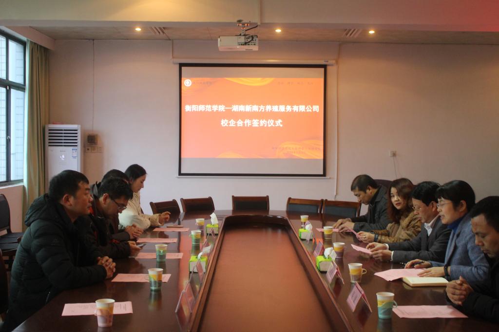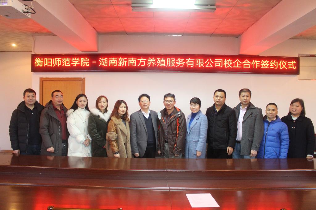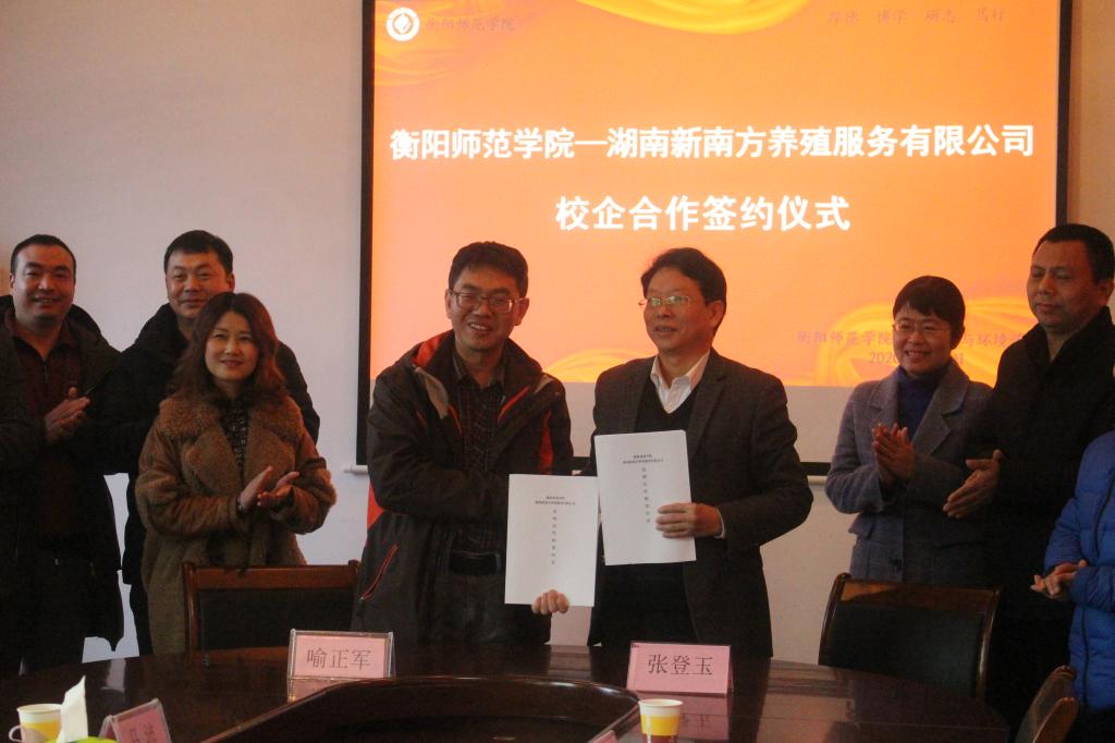 签约仪式由合作发展办公室陈梅香主任主持,湖南新南方养殖服务有限公司各分公司总负责人,生命科学与环境学院院长曹丽敏教授、副院长易诚教授、杨海博士以及师生代表出席签约仪式。