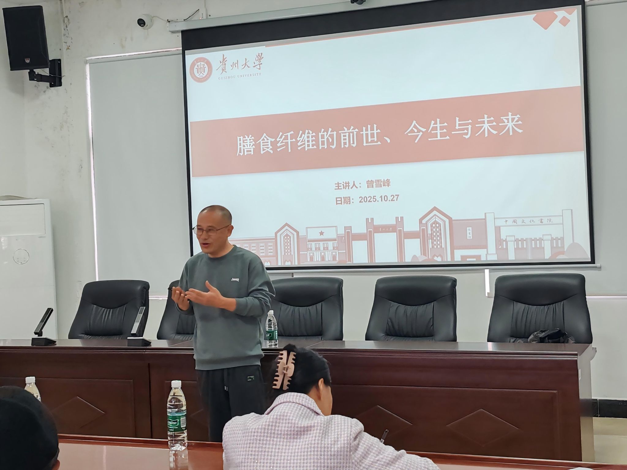 同时,衡岳讲坛第B22期特邀曾雪峰教授,以“膳食纤维的前世、今生与未来”为题做主题报告,买球官网院长易诚教授、副院长陈晓华教授、食品专业宾冬梅教授、李建周、罗运梅等老师莅临本次讲座。