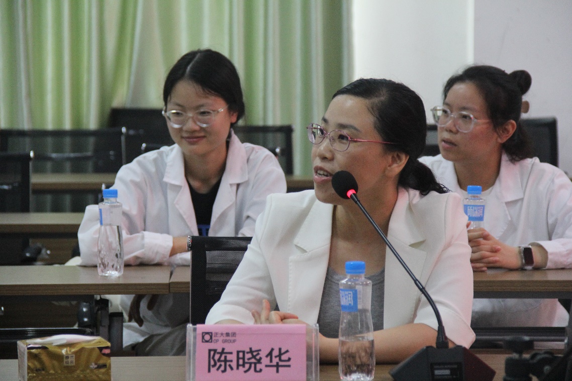 首先,正大公司生产经理带领同学们参观了生产车间,了解了饲料生产工艺流程,参观公司的品管部与储存室,学习产品出入库的检测过程。参观后,正大公司的生产厂长谭厂长、品控的负责人白主管以及人事负责人喻总给师生讲学。喻总介绍正大企业的发展史,企业文化以及企业担当,鼓励我们要学会创新,要吃苦耐劳,坚持不懈。谭厂长给同学们讲解了生产流程,介绍主要的设备工作原理;白主管主要介绍产品品质保障的关键点。通过公司工作人员的现场教学后,同学们与技术人员进行了激烈的交流讨论。最后,陈晓华副院长进行的总结陈词,并对正大公司热情接待、毫无保留为学生授课表述忠心感谢。