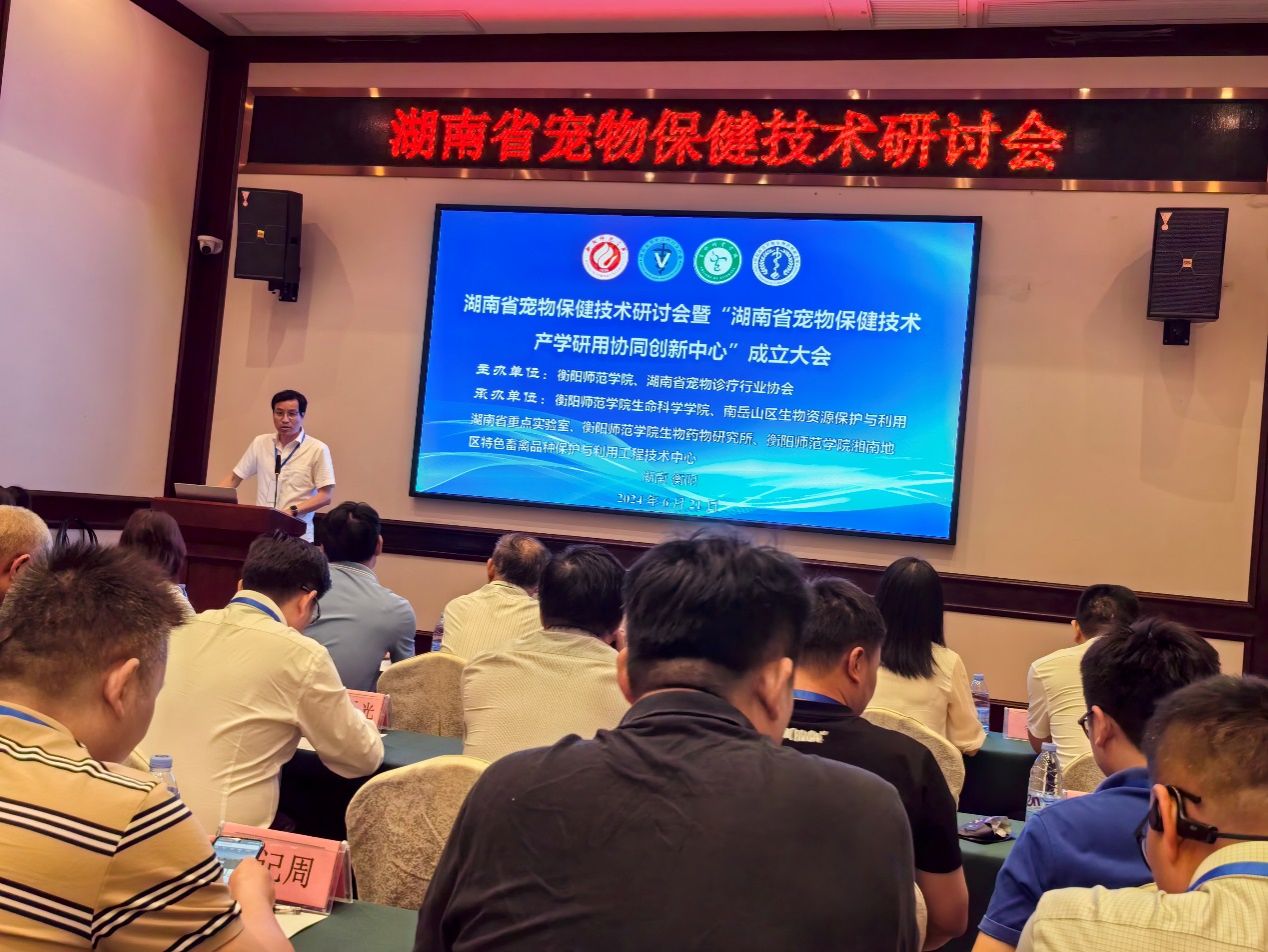 湖南省宠物保健技术研讨会暨“湖南省宠物保健技术产学研用协同创新中心”成立大会于2024年6月21日在衡阳市召开。本次会议由买球官方网站和湖南省宠物诊疗行业协会联合主办,由买球官方网站、南岳山区生物资源保护与利用湖南省重点实验室和买球官方网站生物药物研究所、买球官方网站湘南地区特色畜禽品种保护与利用工程技术中心联合承办。湖南省宠物诊疗行业协会会长钟学辉、秘书长胡锡光、副会长袁焕新、副会长赵道贵、衡阳市畜牧水产事务中心副主任曾繁荣、买球官方网站科研处处长邓运员教授、买球官方网站合作发展与校友联络中心主任陈梅香、买球官方网站现代教育发展学院院长唐斯萍教授、买球官方网站院长易诚教授、副院长杨海教授、副院长陈晓华博士、南岳山区生物资源保护与利用湖南省重点实验室常务副主任唐青海教授及湖南省宠物医疗、保健、食品行业的专家、行业企业代表及高校师生参加了本次会议。