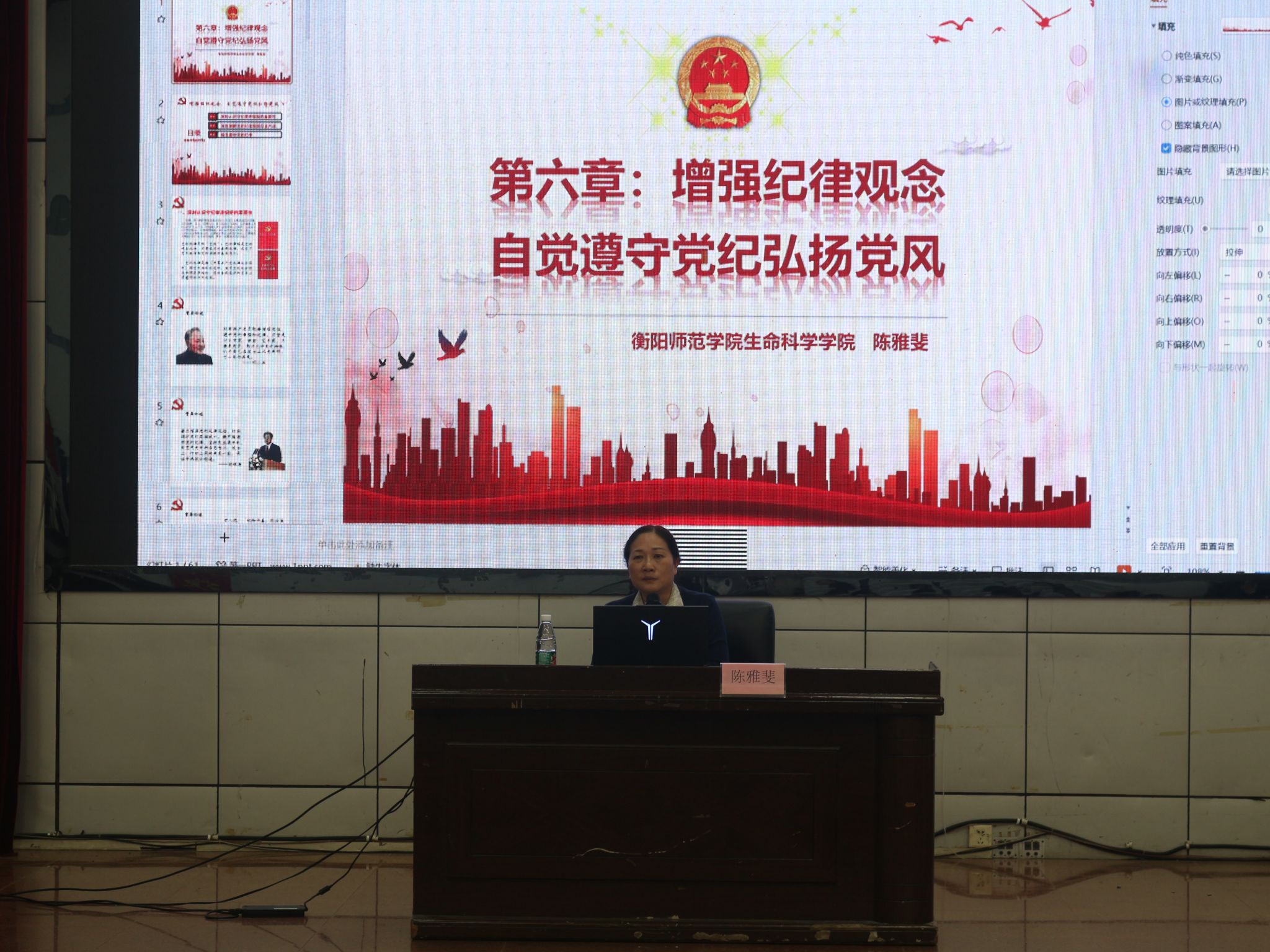 陈雅斐老师讲授了《增强纪律观念,自觉遵守党纪弘扬党风》专题党课,以解放军入上海为切入点,仔细讲述了党的纪律基本特征,强调了党员遵守党纪严守底线的重要性,督促各位学员提高悟性,增强自觉性,远离潜规则。