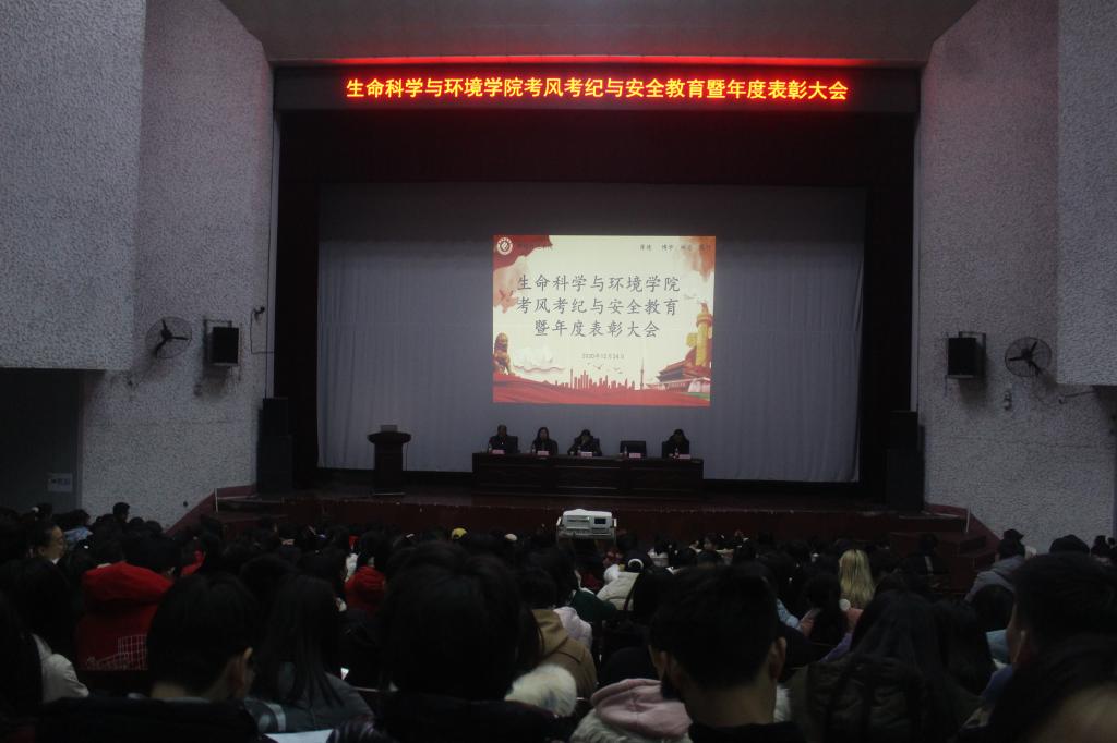 2020年12月24日晚7:30,生命科学与环境学院在排演厅召开考风考纪与安全教育及年度表彰大会。生命科学与环境学院院长曹丽敏、党总支副书记蒋湘祁、副院长易诚、副院长杨海莅临本次大会。曹丽敏院长担任会议主持人,18-20级全体学生到场聆听。