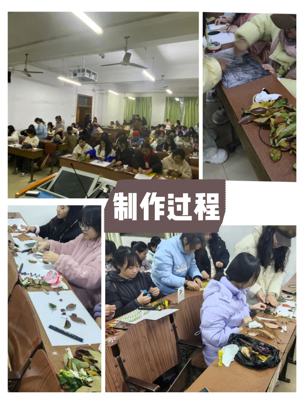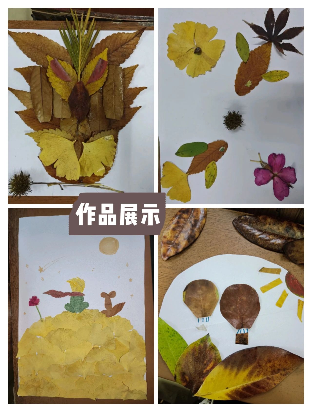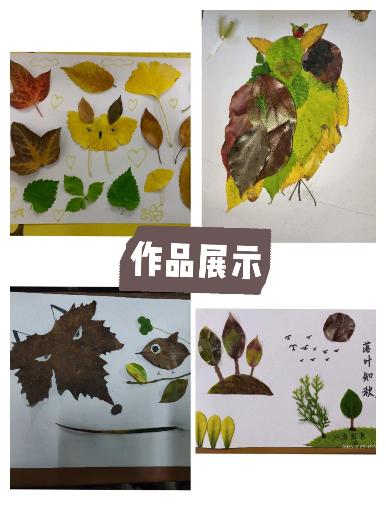 大家将叶子拼凑成各种形态,还可以用彩笔绘画、与胶水拼贴、拿绸带装饰等。让我们尽可能地发挥想象力,去创造出独特的生态画卷。
