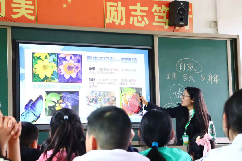 来自买球官方网站生物科学专业师范班谭颖嫱、向冬意、周婷、何洁美4名同学分别带领孩子们赴一场"与昆虫的约定",通过展示昆虫标本近距离给孩子们讲解昆虫结构、生活习性。这次公益课让孩子们对昆虫有了全新的认识,打开了孩子们认识昆虫世界的大门,也点燃了他们探索自然奥秘的星星之火。