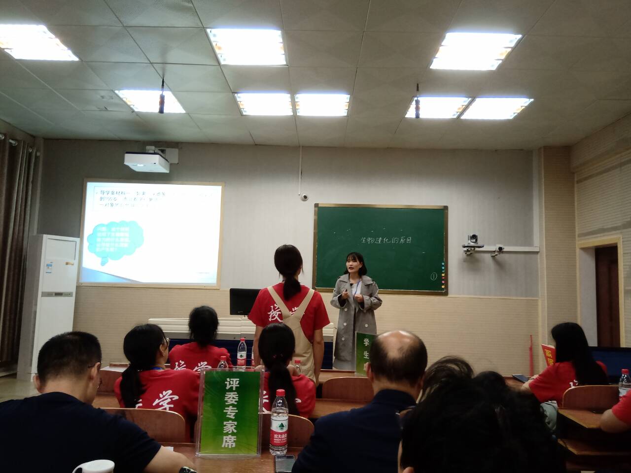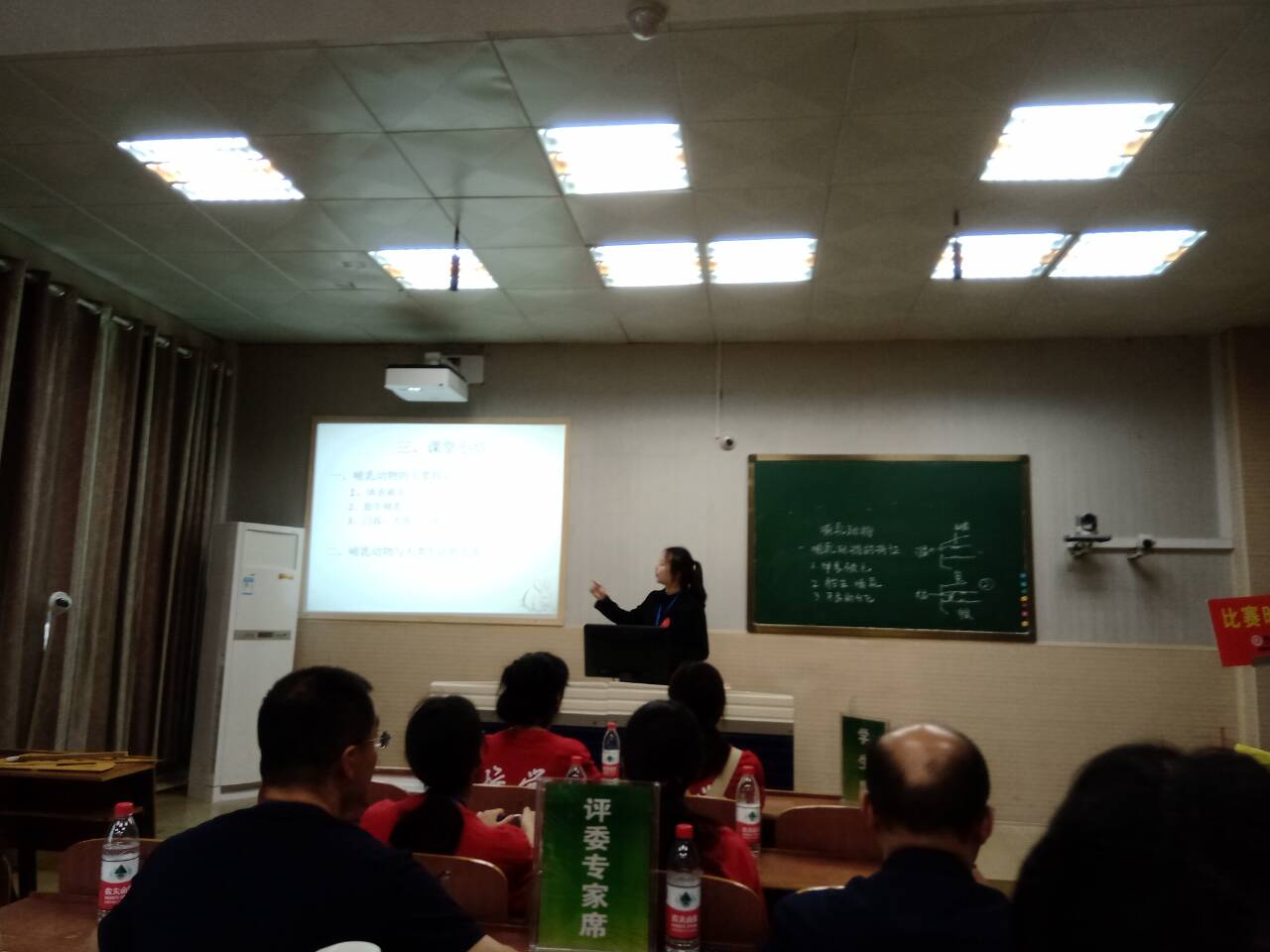 片段教学环节中16级尹亮需要进行教学的内容是“基因在生物体间的传递”。她侧重“以学生为中心”展开教学,首先请学生自主学习,然后就本节课重点,基因是具有遗传效应的DNA片段以及三者之间的关系请同学们小组合作探究。作为一名教师,临场反应能力是不可能缺少的一项素质能力,而16级杨慧菲则在这方面做得不错。在讲课三分钟后,电脑突然黑屏,PPT无法显示,但她沉着冷静,不慌不忙,拿出自画的两张结构图继续授课,丝毫不受影响,得到了评委们的认可。