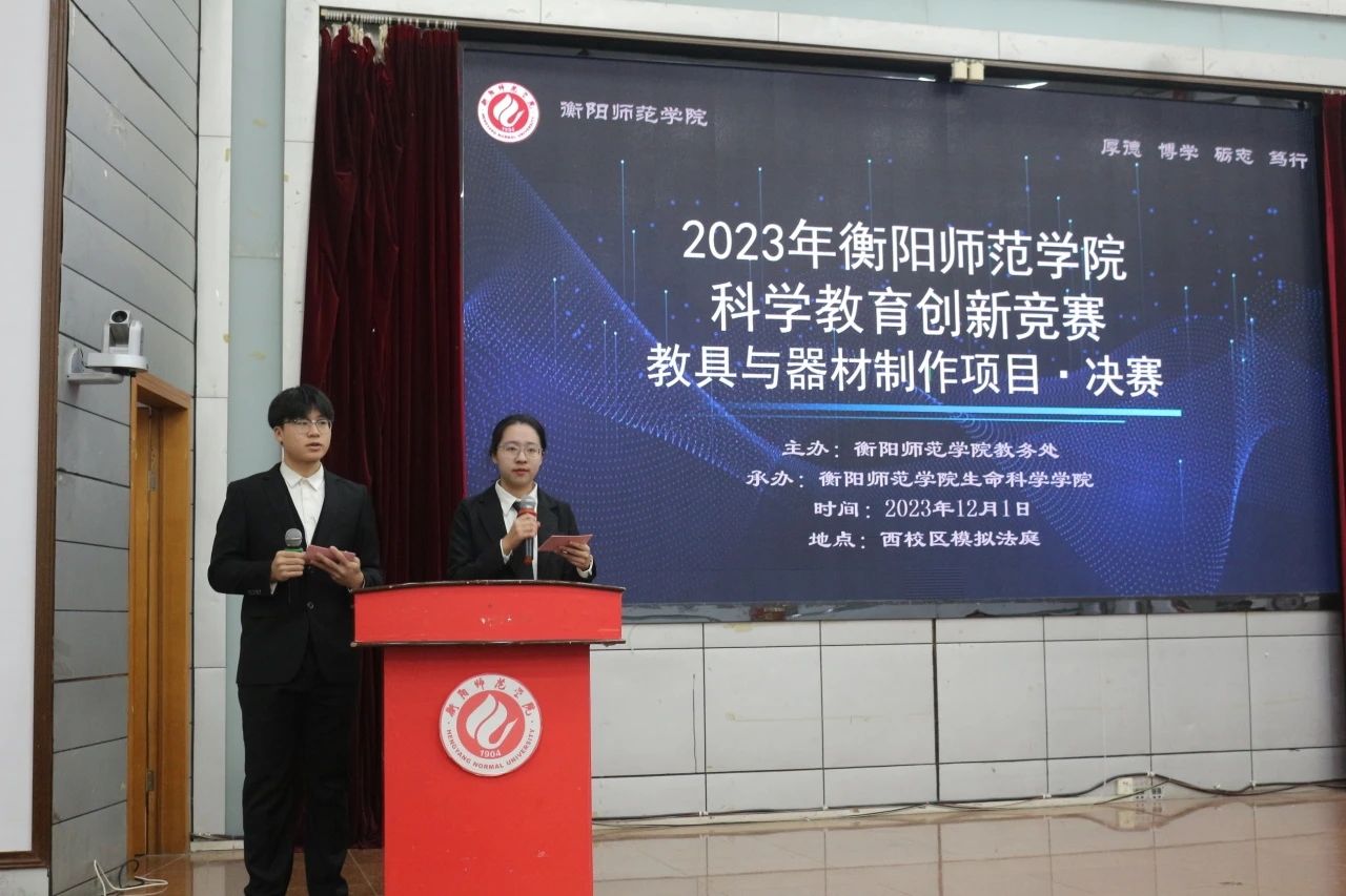 决赛伊始,主持人介绍比赛规则。本次比赛分为两大项,分别是教具与器材制作项目和教学创新项目,选手依次上台展示比拼。选手们手持自己制作的教具讲解其制作过程及用途,条理清晰;进行实验操作,游刃有余;站上讲台即席演讲,妙语连珠;进行模拟授课,落落大方。踔厉笃行助远航,以赛促教竞芬芳。比赛紧张而激烈,每一位选手都全力以赴,富有创新性的教学方式与多媒体等技术相结合,博积勤研以推新,为我们呈现了一场精彩绝伦的比赛。评委老师认真观看每位选手的展示内容,聆听选手的讲述。